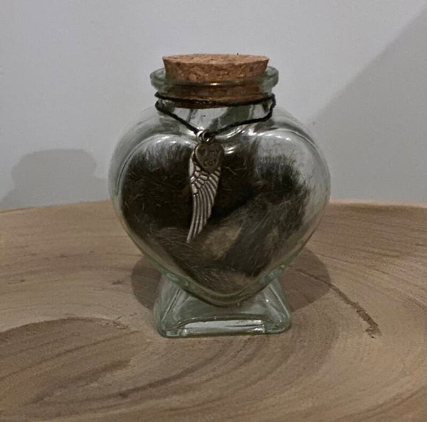 Dit glazen potje is geschikt voor het bewaren van een kleine hoeveelheid haar van een huisdier. Het potje is vervaardigd uit glas, heeft een hartvormig ontwerp en is voorzien van een kurksluiting. Het potje wordt geleverd met een koordje en twee metalen hangers: één in de vorm van een vleugel en één hartvormig hangertje met de tekst “love my cat.